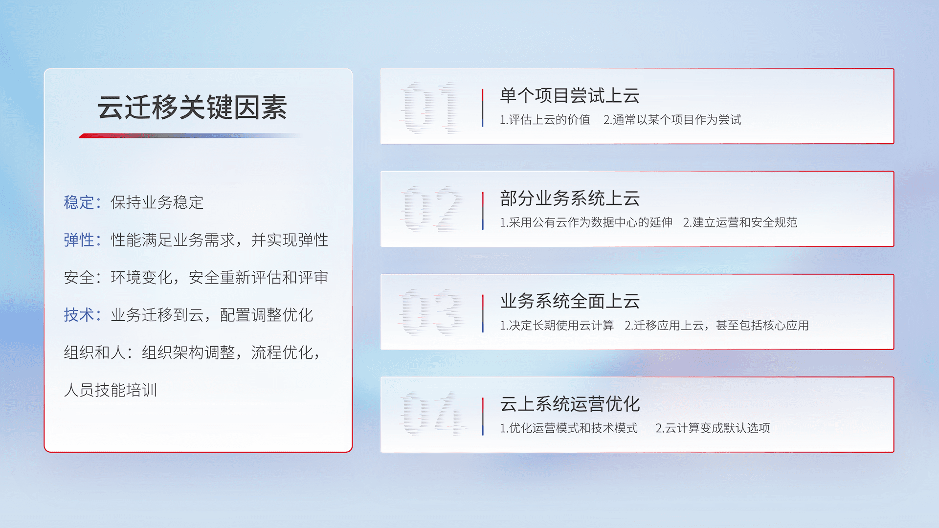 结合实际业务,,从规划设计、、云平台选型、、、云原生改造、、、、数据迁移、、、集成交付,,迁移全过程为客户识别最佳上云路径,,做好风险识别管理,,设计网络架构、、、身份权限、、安全审计合规、、、、操作审计、、、日志审计、、、、监控告警策略、、、多站点容灾设计等,,,,对云上基础设施进行整体规划,,,,提升IT治理水平,,以满足弹性、、、高可用、、、、高性能的需求。。