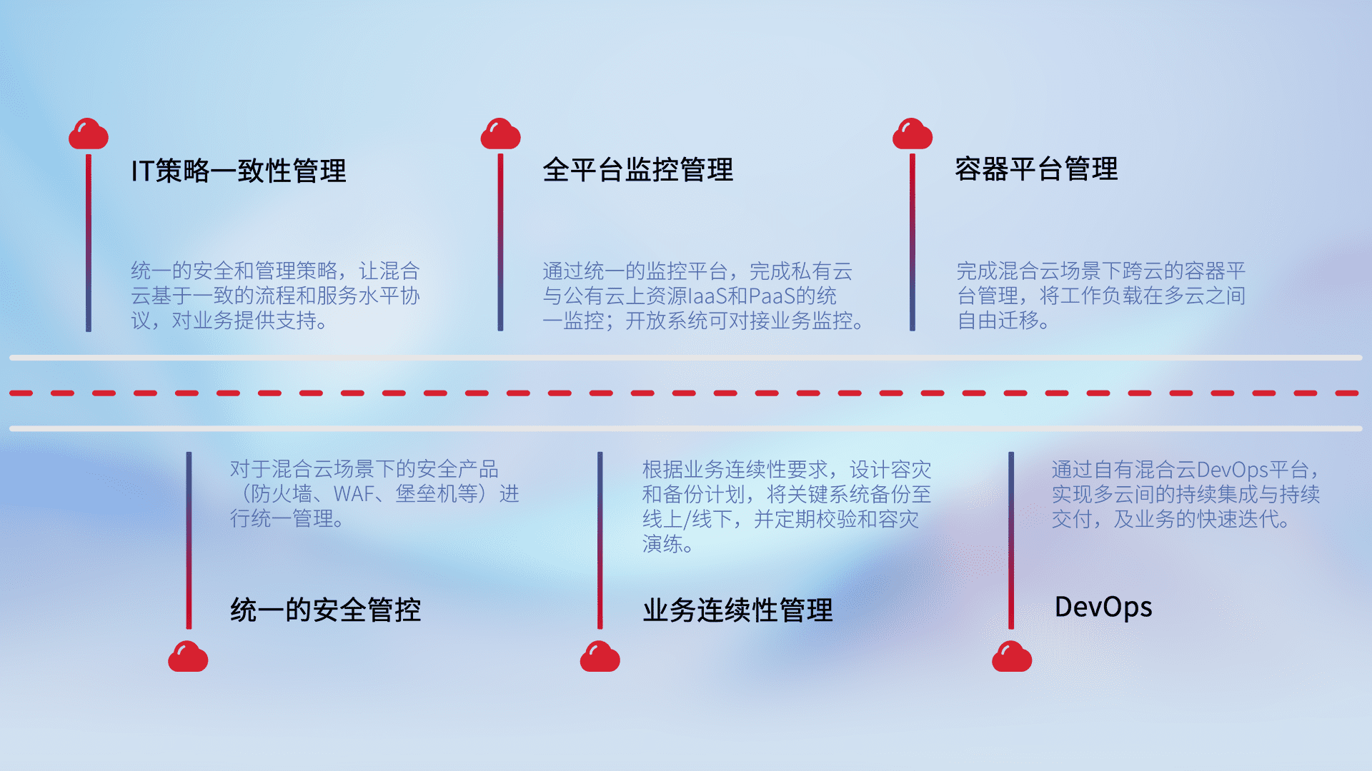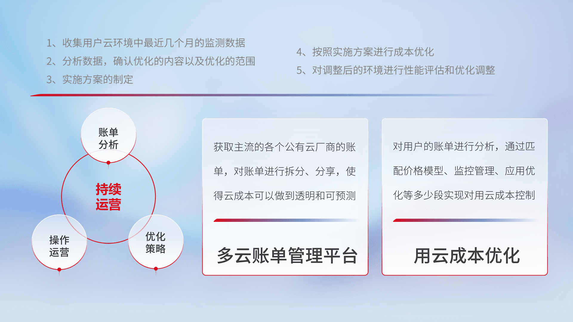 通过多云纳管,,,,以统一的资源数据模型把客户的云资源进行抽象和封装,,进而实现对多云资源的统一操作,,,,保障云资源管理的可靠性、、、、稳定性与可用性。。量身定制化运维内容,,,,配置、、、开发运维、、补丁管理、、备份、、监控、、、、认证和访问管理、、、、审计和日常巡检等,,保障在用云过程中的可靠度,,,稳定度以及高可用率。。。